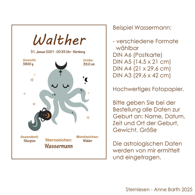 Dein persönliches (Kinder-) BirthChart mit den wichtigsten Angaben als hochwertiger Fotopapierdruck. Perfekt als Geschenk, einzigartig und individuell. (Benötigte Angaben: Geburtsdatum/-ort/-zeit, Name, Gewicht und Größe - bitte bei der Bestellung angeben.)
