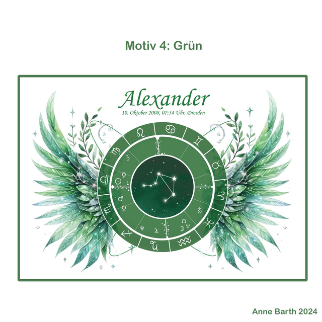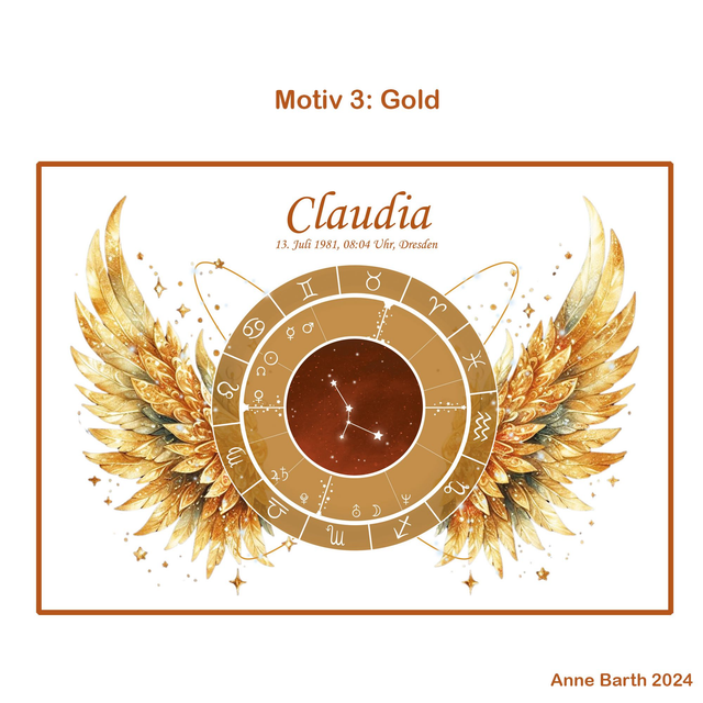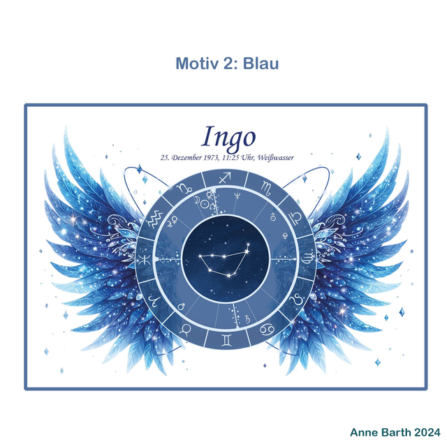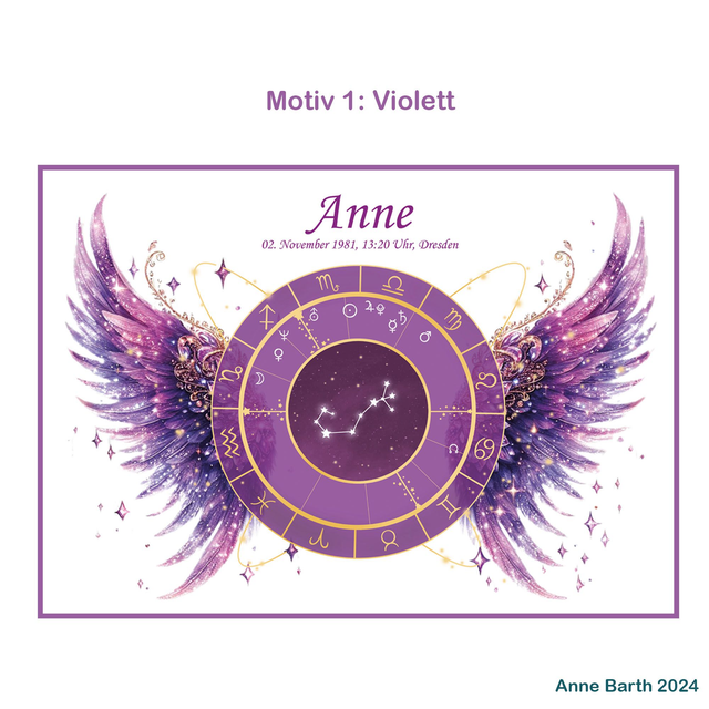 Dein persönliches Horoskop als hochwertiger Fotopapierdruck mit verschiedenen Flügelfarben und Formaten, perfekt als Geschenk, einzigartig und individuell. (Benötigte Angaben: Geburtsdatum/-ort/-zeit, bitte bei der Bestellung angeben.)