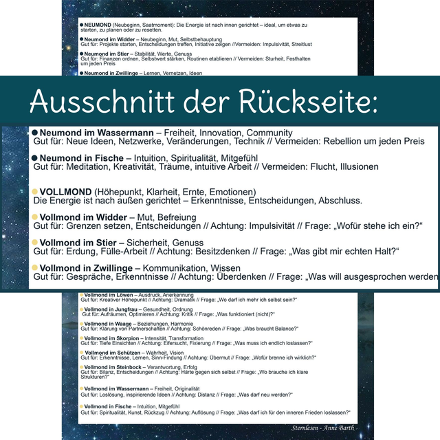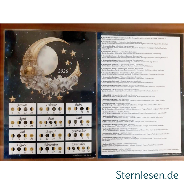Der praktische Mondkalender für das Jahr 2026 zeigt dir alle wichtigen Mondphasen mit Tierkreiszeichen an. Egal ob für Rituale, Gartenarbeit oder einfach für deinen persönlichen Lebenszyklus. Der Kalender ist in der Größe DIN A4 angelegt und laminiert.